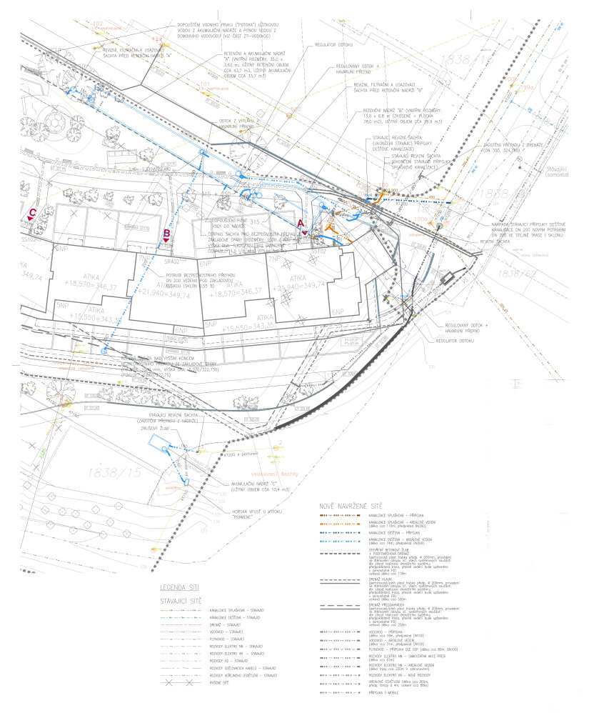 Objekt na geologicky složitém pozemku uzavřeném z jedné strany přírodním parkem se skalnatým profilem a z druhé strany jinou budovou měl složité podmínky pro likvidaci dešťových vod. V návrhu bylo uplatněno technické řešení pomocí akumulace srážkových vod v konstrukci střešního pláště.